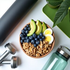 Close-up of a brain-shaped bowl filled with blueberries, walnuts, boiled eggs, and avocado, sitting next to workout gear and a water bottle.